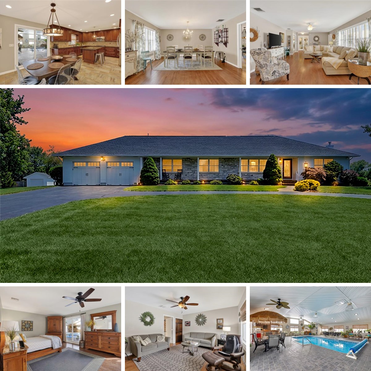 A rare opportunity to own a beautifully maintained custom ranch set on over 2 acres of private, level property in one of Manalapan's most desirable locations. A circular driveway and welcoming front porch create a warm and inviting first impression. The living and dining room combination has lots of natural sun light creating a comfortable and inviting setting for everyday living and entertaining. Hardwood floors throughout. The beautifully custom kitchen features stainless steel appliances, abundant cabinetry, recessed lighting, and a spacious center island, perfect for gathering with family and friends. Just beyond the kitchen is a magnificent indoor resort-style pool area, designed for year-round enjoyment and relaxation. Whether hosting guests or enjoying a quiet evening at home, this incredible space offers a private retreat rarely found in most homes. The pool area also includes a convenient half bath and sliders leading to a maintenance-free deck overlooking the expansive property. The home offers 3 bedrooms and 2.5 baths, including a primary suite with sliders to the pool area. The third bedroom, currently used as a den, features a private entrance and is ideal for a home office or guest space. Additional highlights include a full basement, oversized two-car garage, extra-large shed for additional storage, and the peace of mind of a whole-house generator. Immaculate and truly move-in ready, this exceptional home offers space, privacy, and a unique lifestyle.
